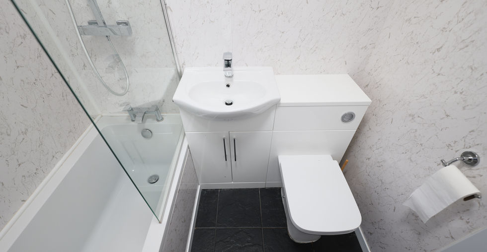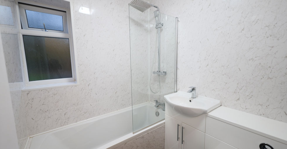 * WHITE Suite Family Bathroom, With Rainfall Shower Over Bath, Approx 6 Months Old